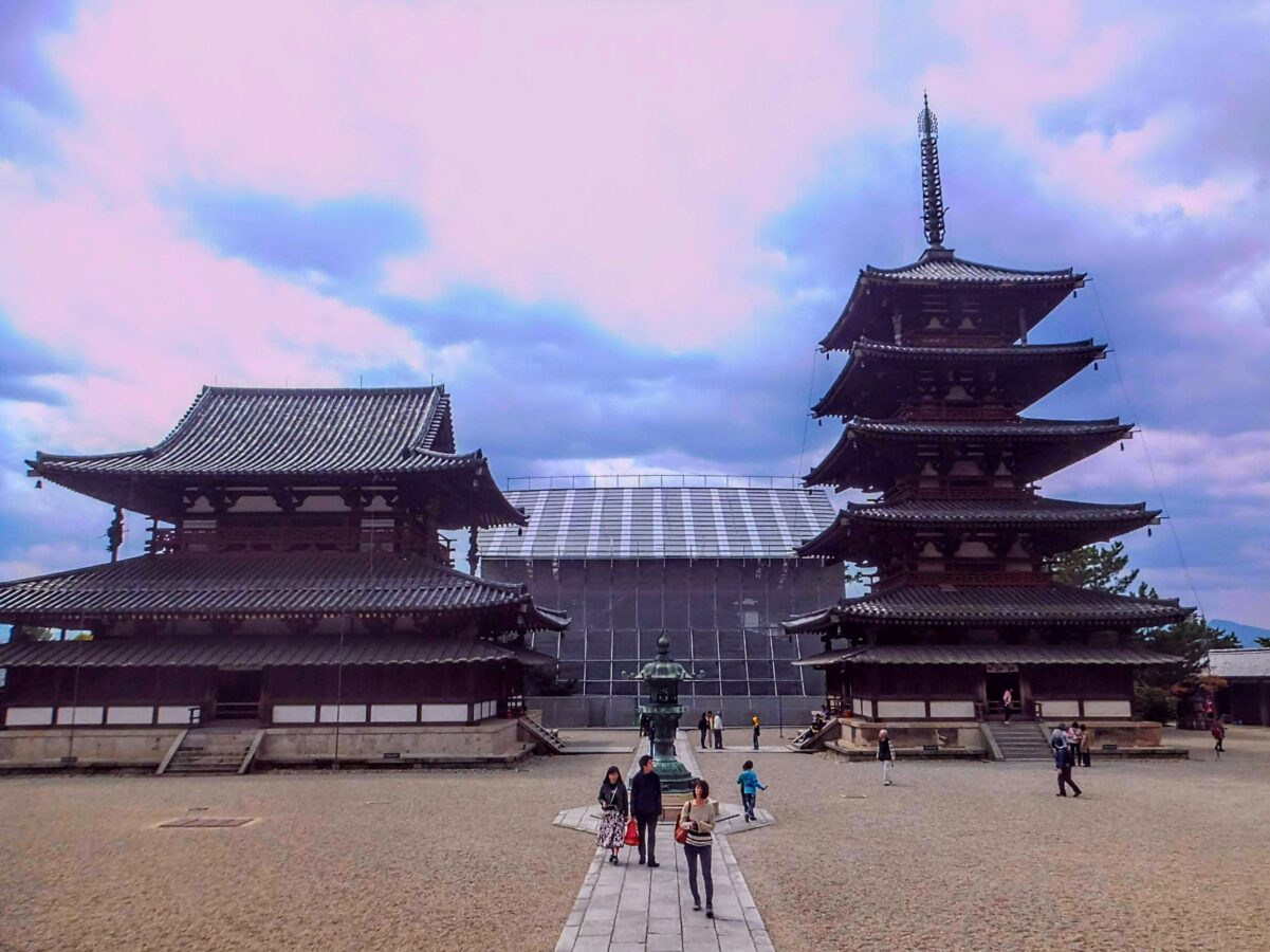 世界最古の木造建築である五重塔や金堂が並ぶエリア
