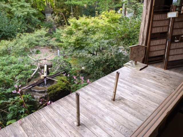 縁側の片隅からは2つの竹が伸びています。こちらは水琴窟につながっており、耳をあてると澄んだ音色が聴こえてきます。使用されているのは、サヌカイトこと讃岐岩。叩くと良い音がするという性質を持ち、石琴などの楽器に利用されることもある岩石です。
