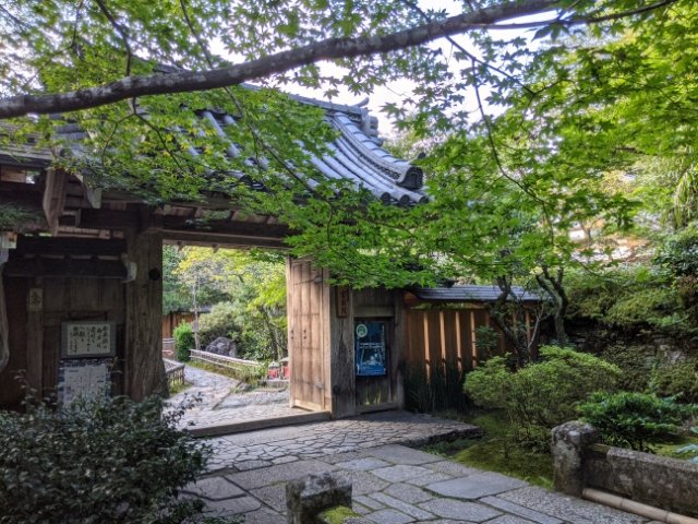 三千院前の参道を奥まで進むと門が見えてきます。ほとんどの人は三千院止まりで、ここまで来ている人は稀。私もノーマークでしたが、たまたまグーグルマップで見かけた額縁庭園の写真があまりにも素敵だったので立ち寄ってみることにしました。