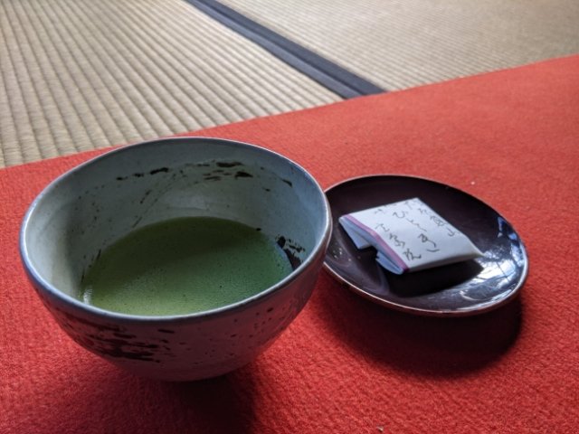 拝観料にはお抹茶も含まれており、受付時にいただいた券を渡すと運んでいただけます。庭園を眺めながらのいっぷくは心がほっと休まります。お抹茶もマイルドなお味でとっても飲みやすいです!