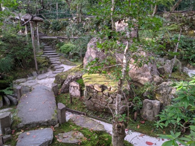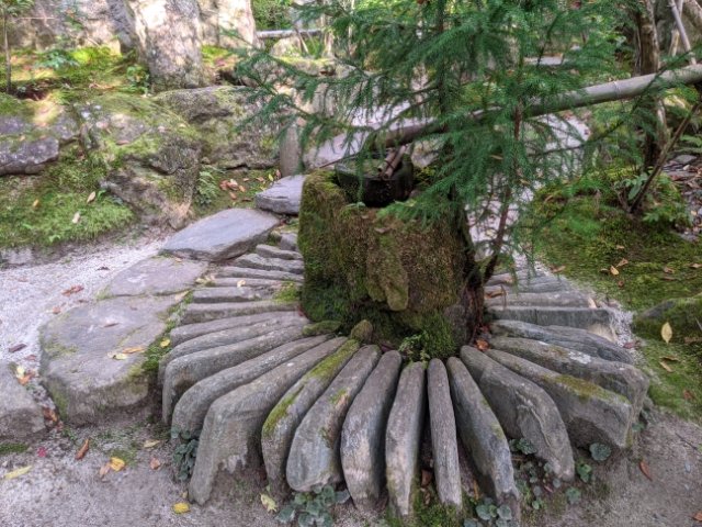 橋のように掛けられた岩を見るといかにも水が流れているような気がしますが、水を用いない枯山水庭園。下を流れているのは白砂の大河です。