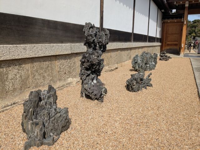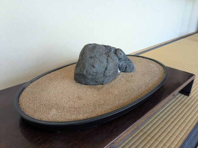 園内で見かけたこちらは水石(すいせき)。自然石に台座を敷いて鑑賞するもの。茶色砂の真ん中に置かれているのは安倍川石です。