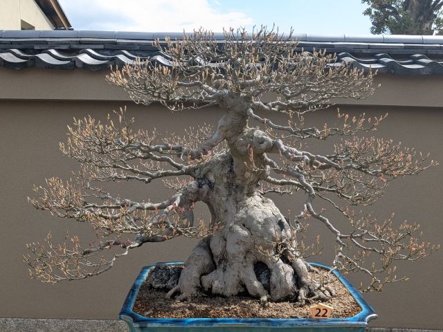 「22 宮様楓」は伏見宮貞愛親王の「遺愛樹」であるそう。遺愛樹というのは、著名な人物が生前愛していた樹木のこと。樹齢はこちらも250年。秋になれば紅葉も楽しめる、このような盆栽を「葉物」と呼ぶこともあるそう。