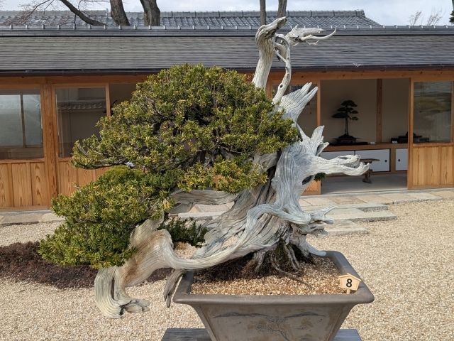 こぼれ落ちそうな「8 一位 銘 麒麟」。なんの1位かと思いきや、「イチイ」という樹木。こちらも松柏盆栽に分類される樹種です。樹齢はなんと500年!!世界盆栽大会のポスター樹に選ばれたそうです。