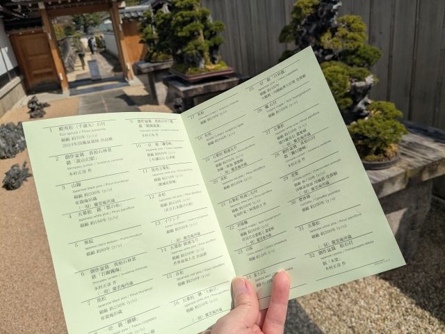 各盆栽に案内は添えられていませんが、受付でこちらの目録をいただけます。鉢の番号と照らし合わせると、樹種や樹齢などの情報を得ることができるのです。
