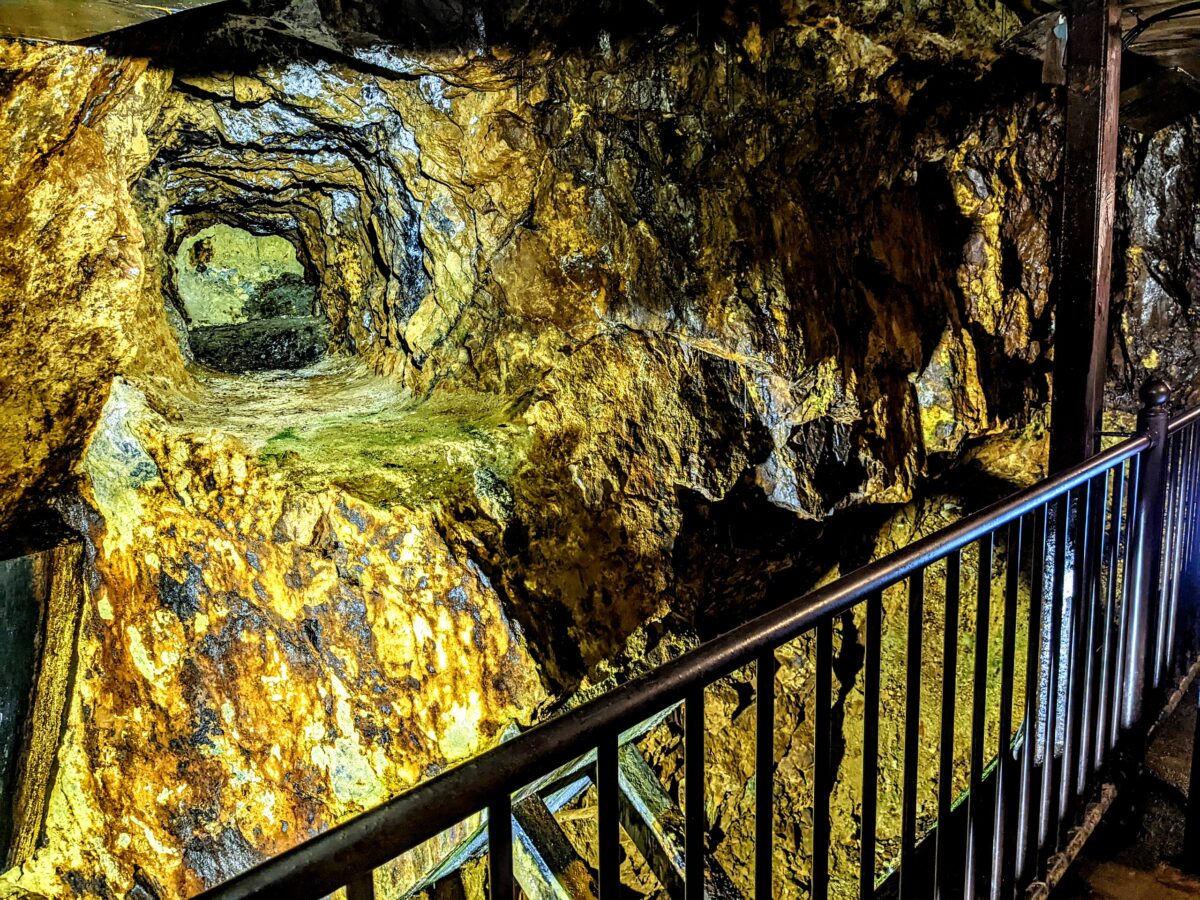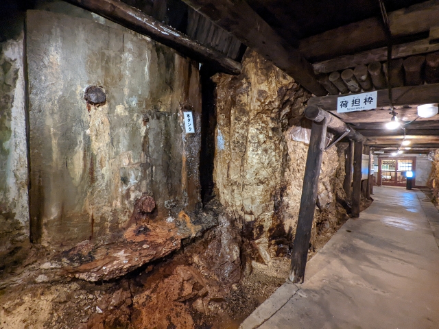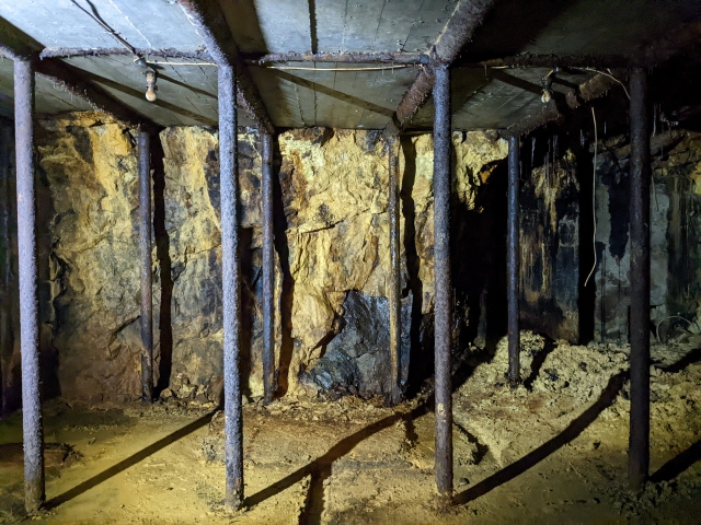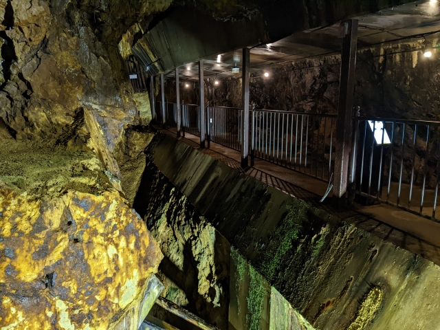 全長777mに及ぶ坑道を進んで行きます。観光用に整備されているとはいえ、壁面などは当時のままで保存されており、なかなか生々しい。