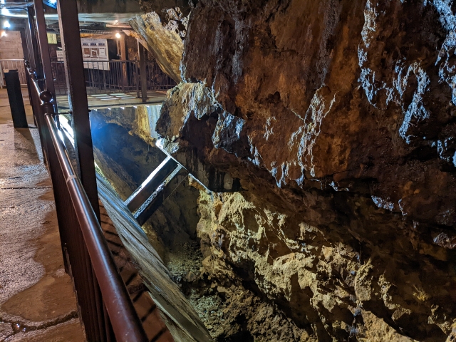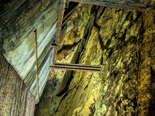 こちらの縦に亀裂の入ったような空洞は、シュリンゲージ採掘法という方法で採掘した跡。30mほどとかなり高くまで割れ目が伸びており、とっても迫力あります。