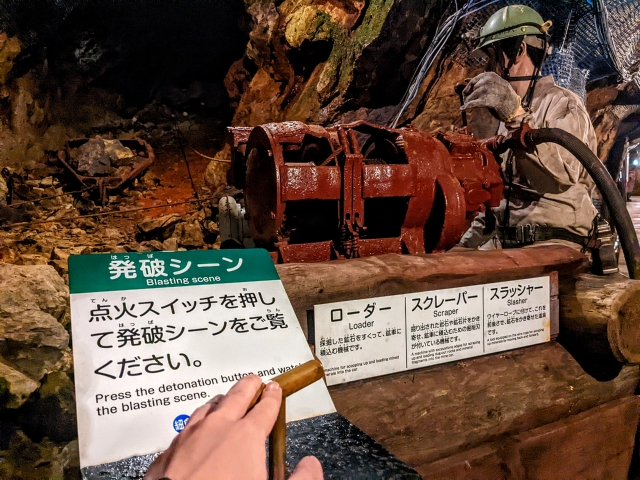 削岩機で空けた穴に火薬を詰め込んで爆破していた発破作業。点火スイッチを押すと、発破シーンが!!!どうなるかは実際に押してみてのお楽しみ・・・。