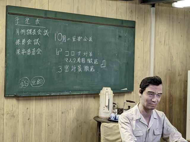 事務所内を覗いてみると、黒板に記されていた「10月の重要会議」はなんと「コロナ対策」!マスク着用徹底、3密対策徹底と、コロナ禍はこんなところにまで及んでいました。