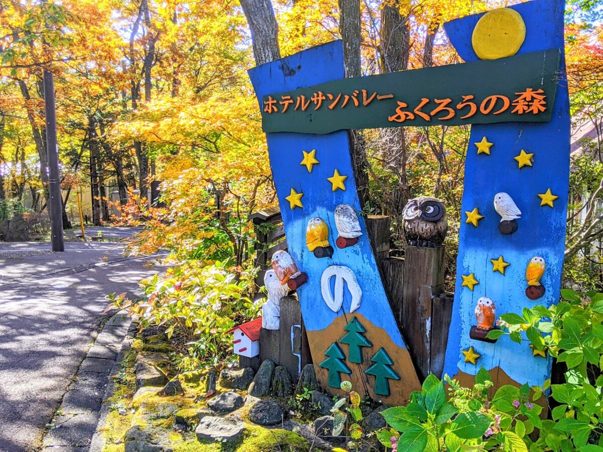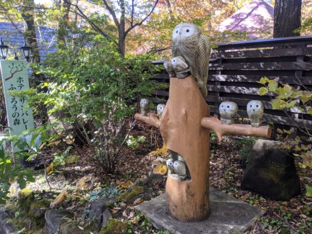 周辺には木彫りのふくろうがたくさん!こちらは那須のチェーンソーアーティスト・松原幸治による作品。かわいらしいく素朴な雰囲気に胸が躍ります。10月末に訪れたところ、色鮮やかな紅葉も楽しめました。