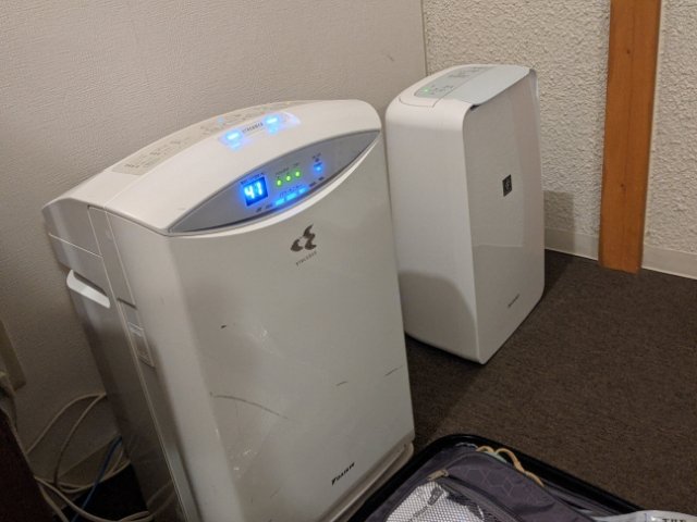 部屋にはテレビ、エアコン、ポット、冷蔵庫、風呂、トイレがついてます。さらに空気清浄機と加湿器まで標準装備。暖房必須となる冬場は、加湿器の存在がとってもありがたい。