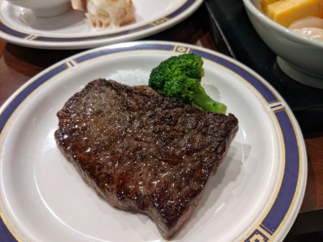 栃の木黒牛ステーキも1人1枚限定で食べることができます。シェフの方が目の前で焼いてくれる、ホテルビュッフェあるあるのやつです。
