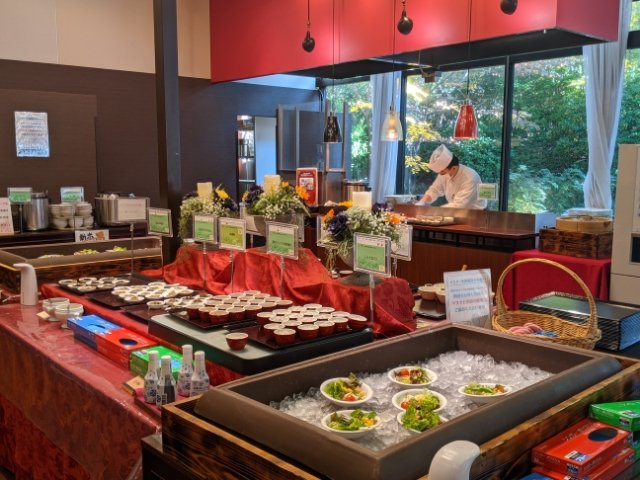 朝ごはんもバイキング。和食、シリアル、パンなどいろいろ揃ってます。ミニラーメンもあり、朝ラーできます!
