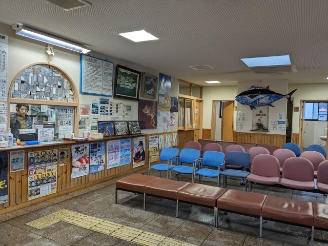待合所&券売所は広々。「忘れ物」と書かれたいろいろなものが詰まったダンボール箱がとっても気になります。