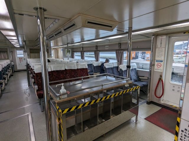 船内は基本屋内席。独特の柄のシートと、白いテカテカしたヘッドレストがレトロな雰囲気です。なんだかバスのシートみたいですね。