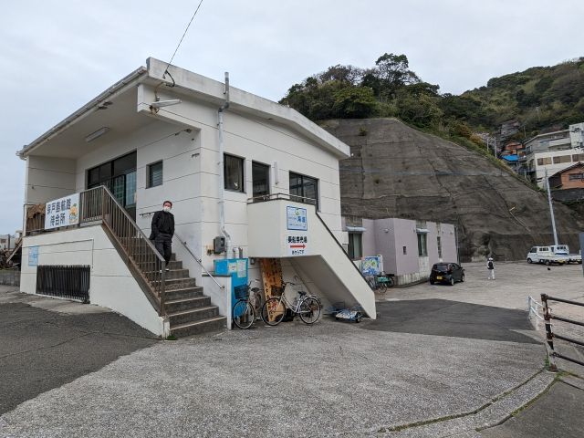 白い建物は待合所。1階には名物ひゅうが丼が食べられる食堂「海道」も入っています。島内にトイレはあまりないので、ここで済ませておいたほうが良いです。