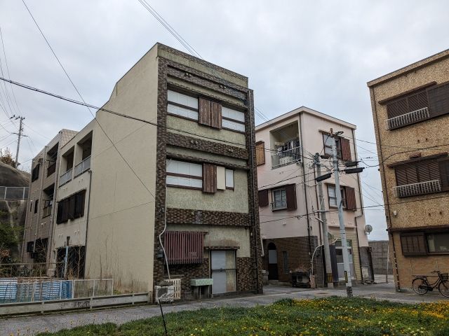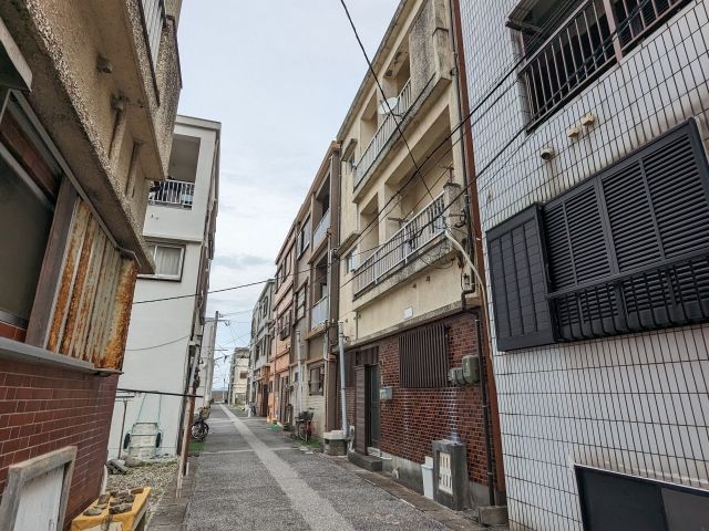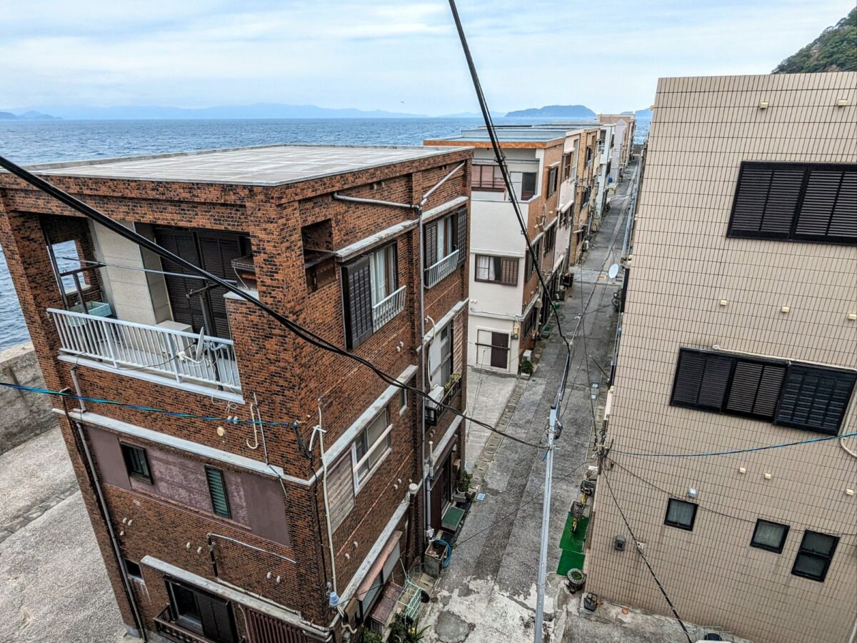 背の高い建物が隙間なく並ぶ様子は、まるで都心の繁華街の雑居ビル群のようです。それが離島の海辺にあるというのが凄く違和感。