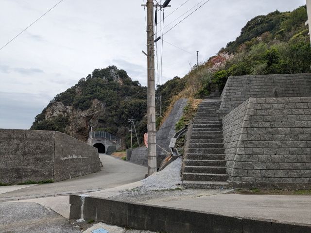 石鎚山へ行くには、埋立地集落の外れの階段を登ります。