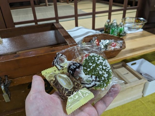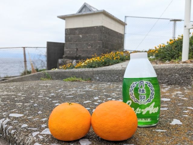 ボランティアで掃除しているおばあちゃんが、「神様のおさがりあげるわ」と、みかんと月桂冠を渡してくれました。お供え物を取り換える際は、おさがりとしていただくそうです。