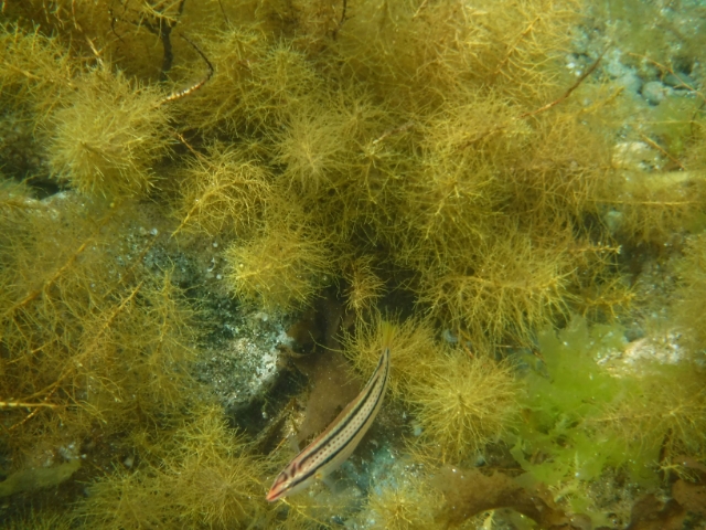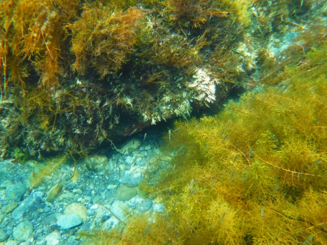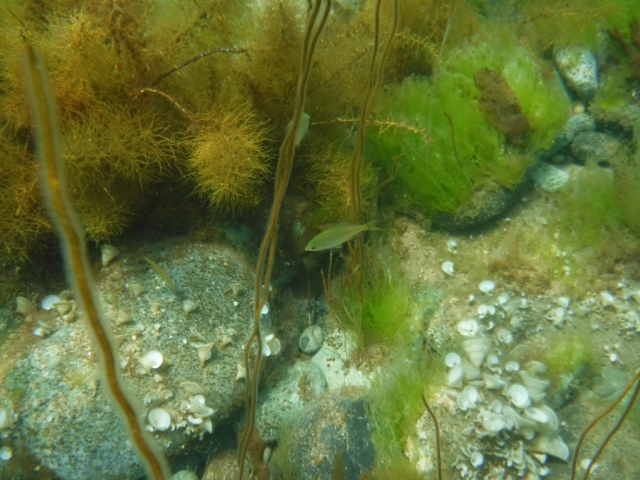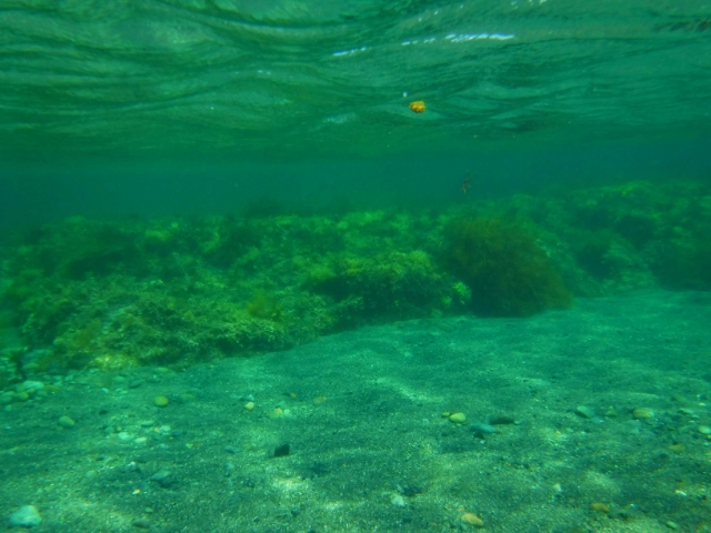 海の水はあたたかいので、ずっと泳いでいられそう。引き潮&浅瀬なので魚は少なめですが、よく見るとキュウセンや稚魚の群れが海藻に隠れるように泳いでます。