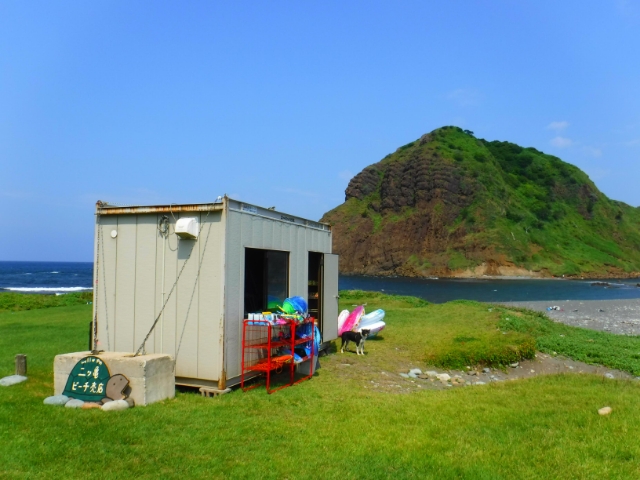 プレハブの海の家では、飲み物やお菓子などの軽食、ビーチサンダルなどの海グッズが売ってます。佐渡島をはじめ、日本海側の一部地域では、海の家のことを浜茶屋というらしい。