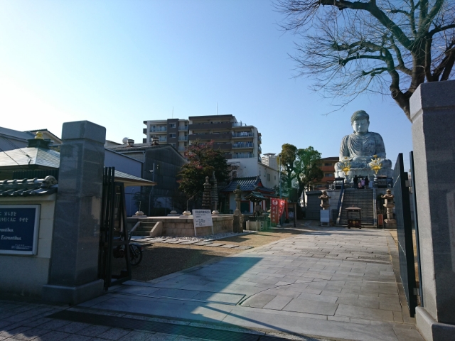 そんな深い歴史を持つ能福寺、ベイエリアや中華街といった神戸の中心地からは少し離れたところにあります。観光客がほとんど訪れず、静かな町なか。境内に入ると、すぐに真っ白な大仏様の姿が見えてきました。
