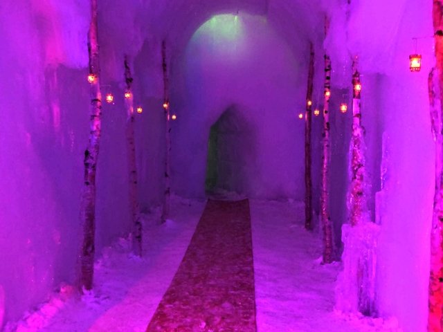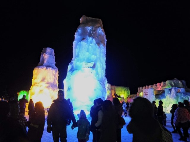 トンネルを抜けた先には、大きな氷のオブジェが立ち並ぶ会場が広がります。日中のクリアブルーに輝く氷柱もステキですが、日が暮れてからライトアップされて幻想的に輝く姿も幻想的で美しい。
