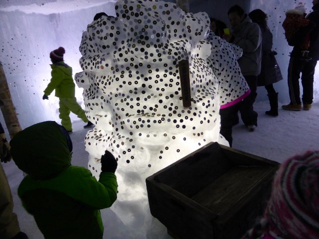 このオブジェは雪ではなく氷でできています。支笏湖の水を組み上げ、スプリンクラーで吹き付け、少しずつ凍らせることで形作っているそう。