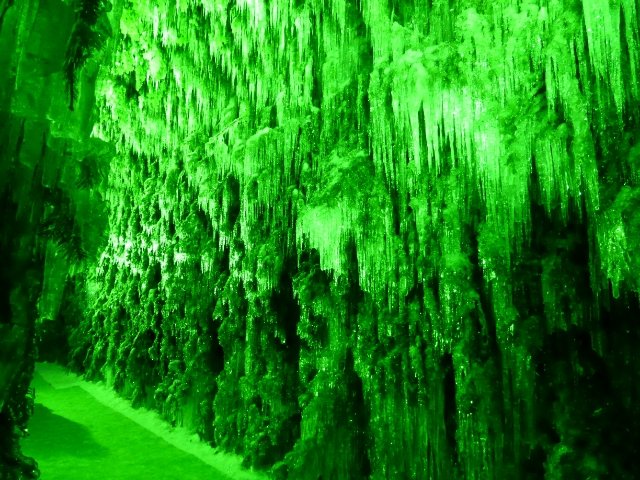 氷像の中には、独特な世界観が広がっています。あるスペースは、一面緑色の照明で照らされたグリーンの世界。