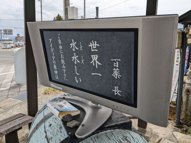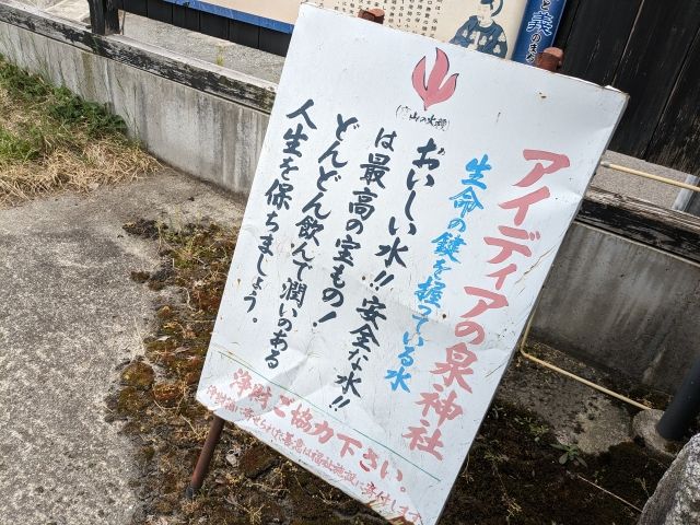 境内に立てられた看板に書かれているのは「おいしい水!!安全な水!!は最高の宝もの!どんどん飲んで潤いのある人生を保ちましょう。」という、非常に扇動的なコトバ。