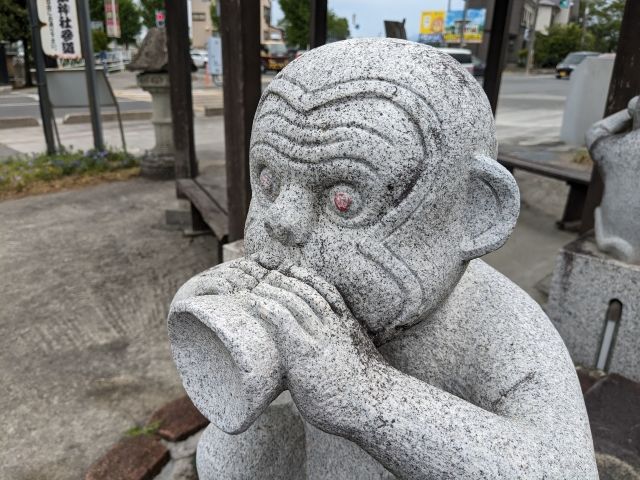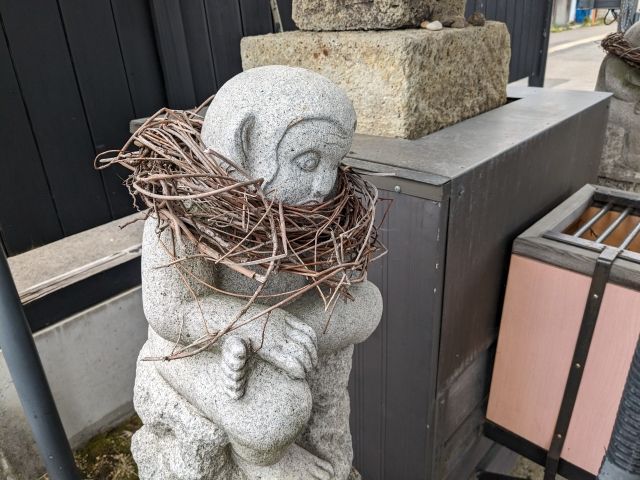 祠を守るのは、狛犬ならぬ狛猿。片脚を上げて肘をついた半跏思惟のポージングが悩ましい姿。首にはツルのリースが掛けられいるのですが、飾りっけが少ないのでちょっと攻撃的に見えます。あっ、もしかして先ほどの吊り下げプランターで栽培された植物で作られたのでしょうかね。