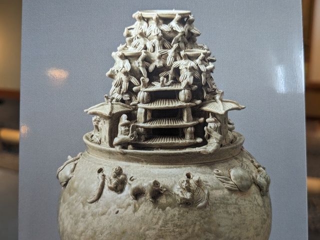 中国・西晋時代の作品。壺の上に多数の鳥が飛び立つ姿が象られており、非常い見応えがあります。鳥の群れの下には楼閣と笛や鏡を持った人々、壺の胴部分にはカニ、ヒツジ、サンショウウオなど様々な動物の姿も。細部までじっくりと観察したくなる壺です。