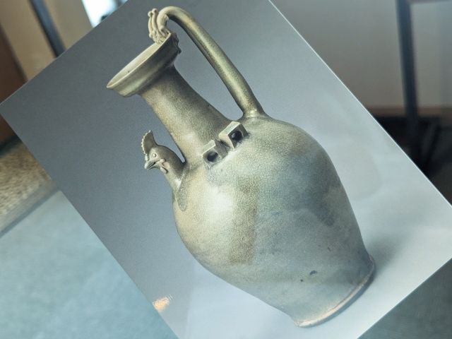 中国・南北朝時代の作品。滑らかな壺の肩にニワトリの頭部が添えられているユニークな姿が特徴的です。壺の肩の部分には四角い突起のようなもの、さらに把手部分も何か生き物を象っているかのようなデザイン。シンプルに見えて不思議と吸い込まれる作品です。