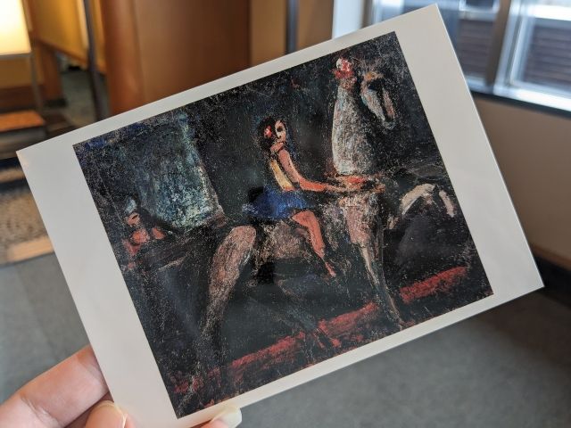 《小さな女曲芸師》は、白馬にサーカスの少女がまたがる姿を描いた作品。全体的に暗い印象ですが、その分少女の青いスカートや髪飾りが目立ちます。