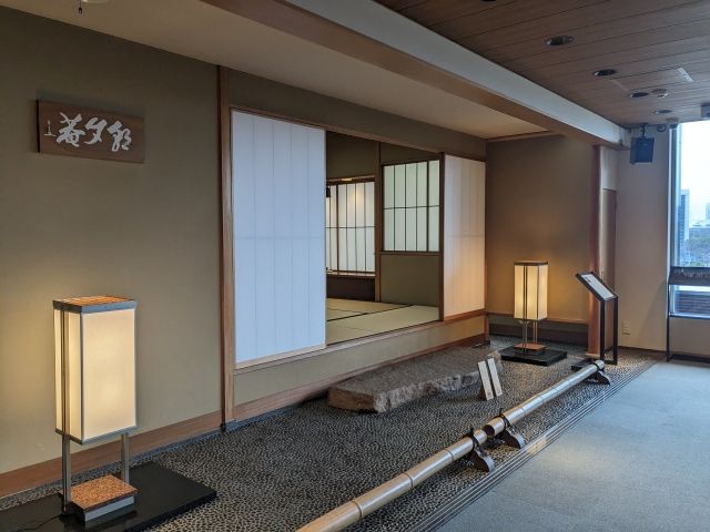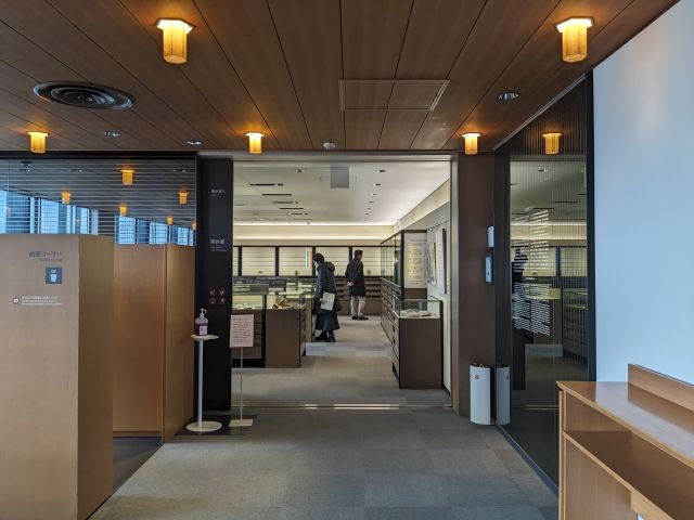 ロビーの側には茶室朝夕菴(ちょうせきあん)という茶室も設けられています。中を覗くと、茶碗、茶器、掛軸、青磁の花入など美術館のコレクションが用途に合わせて展示されていました。(※写真撮影NG)