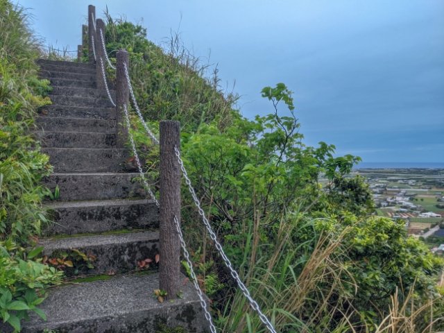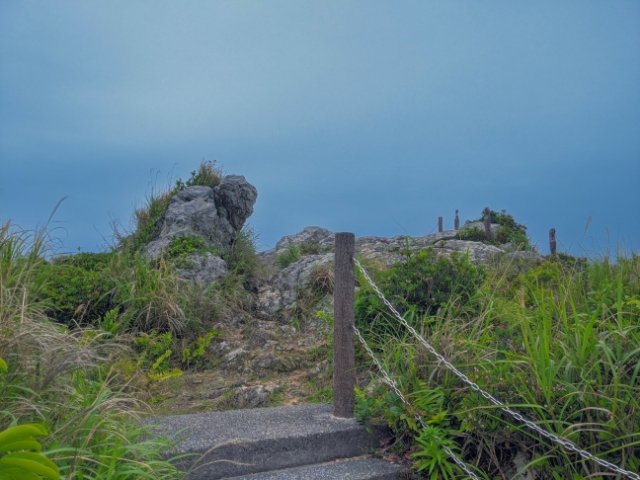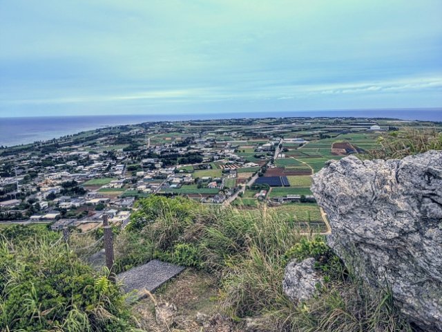 ここからは島内をぐるっと見渡せます。視界一面、360°広がるパノラマは爽快そのもの!少々雲が出ていますが、瀬底島、水納島、伊平屋島、伊是名島は見えました。わずか10分の登山でこの景色が見れるなんて、おそるべきタイパです。