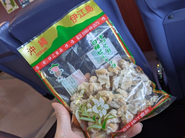 フェリーターミナルのお土産屋さんで買ったこちらのお菓子。伊江島名産のピーナッツ(じーまみー)に白糖をまぶしたその名も白糖ピーナッツ。黒糖はよく見かけますが、白糖が珍しくてうっかり買ってしまいました。