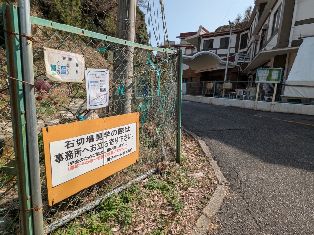 神武寺駅からカウントして20分程で、老人ホーム「逗子ホームせせらぎ」が見えてきます。「石切場見学の際は事務所へお立ち寄り下さい。」とのこと。