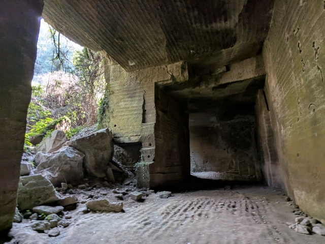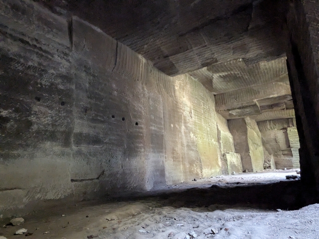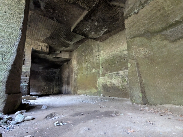この石切場は立ち入り禁止にはなっておらず、自由に中に入ることができます。内部は高さ6mほどの広々とした空間。ひんやりとした空気が漂い、神秘的な雰囲気を感じます。
