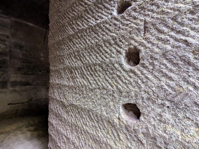ざらざらした壁面は、手ノミで手掘りした跡。空けられた穴は、かつて足場をつくった跡であるそうです。
