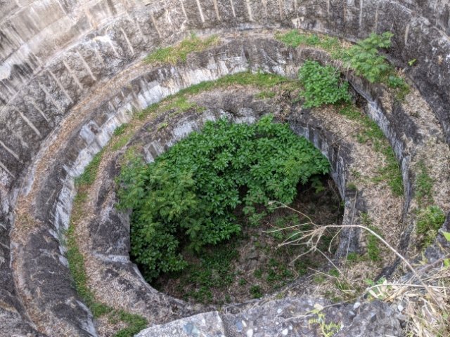 覗き込むと、円形の穴がぽっかりと開いた戦争遺跡の姿が!緑の植物が生い茂っており、自然に溶け込んでいく様子がとっても美しい。長さ18m、射的距離35kmにも及ぶ戦艦土佐の40cm主砲が設置されていたそうです。