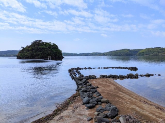 ここは「トンボロ現象」がおこる場所で、干潮時に訪れると砂州による参道が浮かび上がり、歩いて島へと渡ることができます。