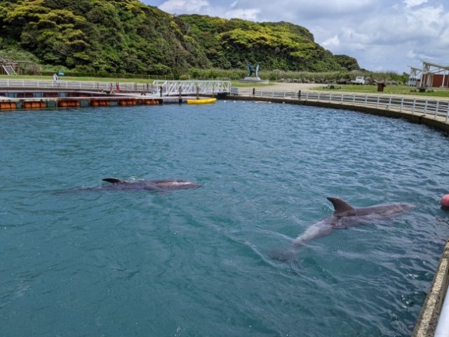 壱岐北部、勝本エリアにあるイルカパークは、自然の入江を利用してイルカを飼育している施設。5頭のハンドウイルカたちが、自由に過ごしています。