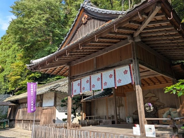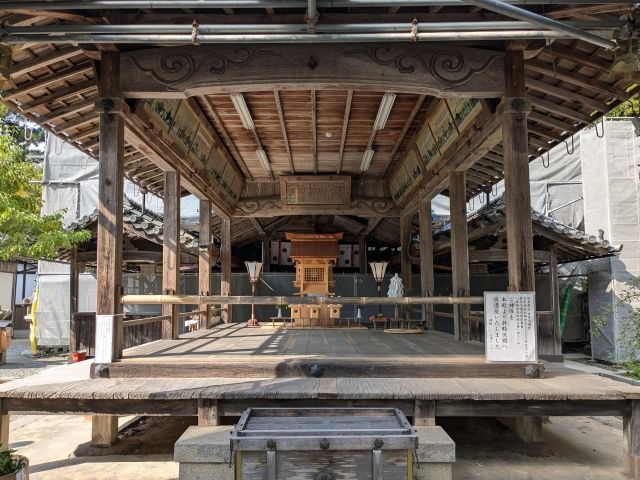 上った先にあるのは舞台のような姿の拝殿。その奥にある本殿は、保存修理工事につき仮殿に仮遷座中でした。拝殿を時計回りに3回まわってお詣りするのが丁寧な参拝作法であるそうです。