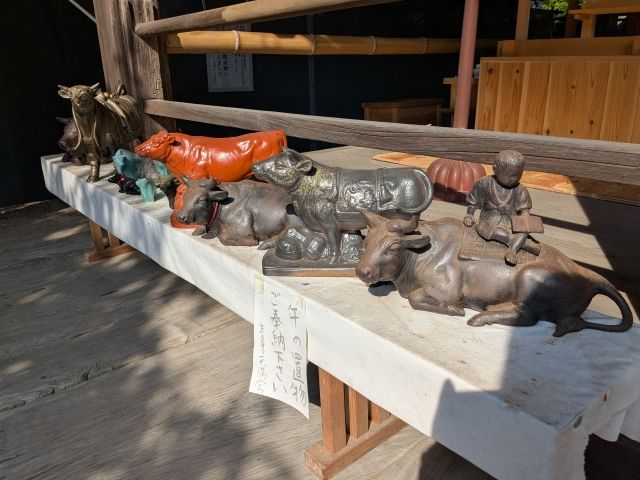 社殿のそば並ぶのは牛の置物。天満宮の神使は牛であることから、牛の奉納を受け付けています。