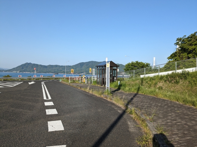 このレモン谷には駐車場がありません。また、周辺の道も幅が狭く、路肩への駐停車も困難。多々羅大橋の北側にトイレスペースがあり、駐車できそうな雰囲気ですがここはバスの待合所であるため「一般車両乗り入れはご遠慮ください」となっていました。