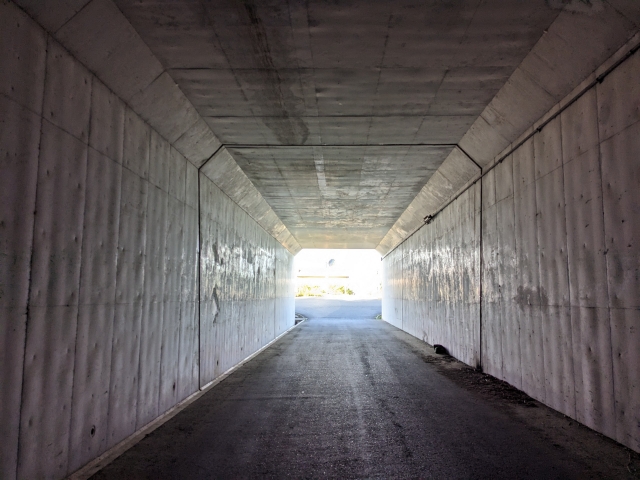 進んで行くとトンネルで高速道をくぐり反対側へ。その先はしばらくは高速道沿いの道を進んで行きます。