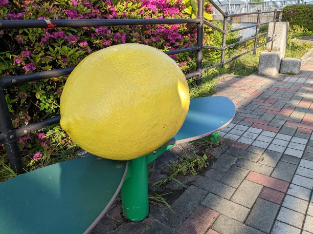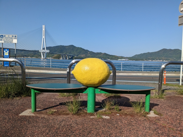 多々羅大橋の歩行者・自転車ゲートの近くには「レモンのベンチ」。ひと休みしたり記念撮影にもおすすめです。