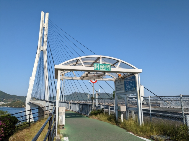 PAから約10分、多々羅大橋のゲートに到着!料金所とありますが、歩行者は無料です。