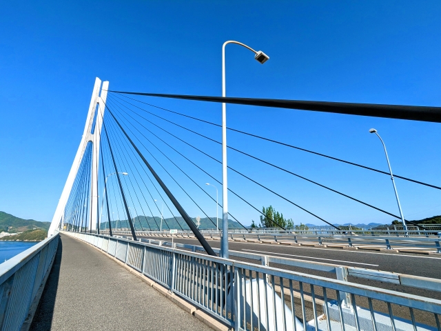 生口島と大三島をつなぐしまなみ海道の橋、多々羅大橋。しまなみ海道の橋は自転車や歩行者が横断可能となっており、この橋もまた自由に通行することができます。
